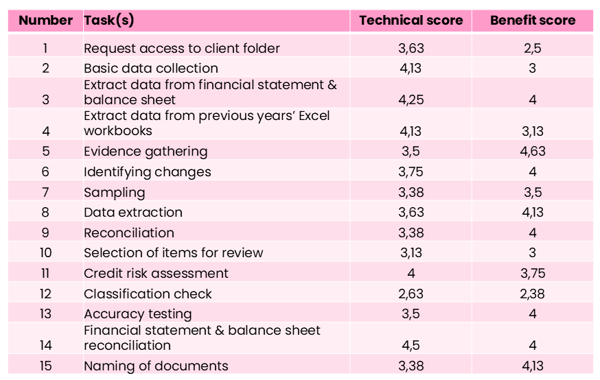 Tämänlaisten tehtävien soveltuvuutta ohjelmistorobotiikalle lähdettiin arvioimaan viitekehyksen avulla. Arvioinnissa käytettiin Delfoi-menetelmää asiantuntijoiden arvioiden keräämiseen ja yksimielisyyden saavuttamiseen automaation kannalta sopivimmista tehtävistä. Alla oleva taulukko esittää arviointien lopputuloksen tehtävien soveltuvuudesta ja hyödyllisyydestä.