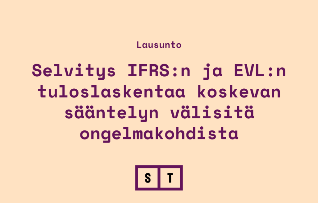 Valtionvarainministeriö on laatinut selvityksen yhtiökohtaisen IFRS-tilinpäätöksen ja elinkeinotoiminnan verottamisesta annetun lain tuloslaskentaa koskevan sääntelyn välisistä ongelmakohdista. Suomen Tilintarkastajat (ST) kannattaa lähtökohtaisesti selvityksessä esitettyjä lainsäädäntömuutoksia, mutta nostaa lausunnossaan esiin useita valmistelussa huomioitavia seikkoja.